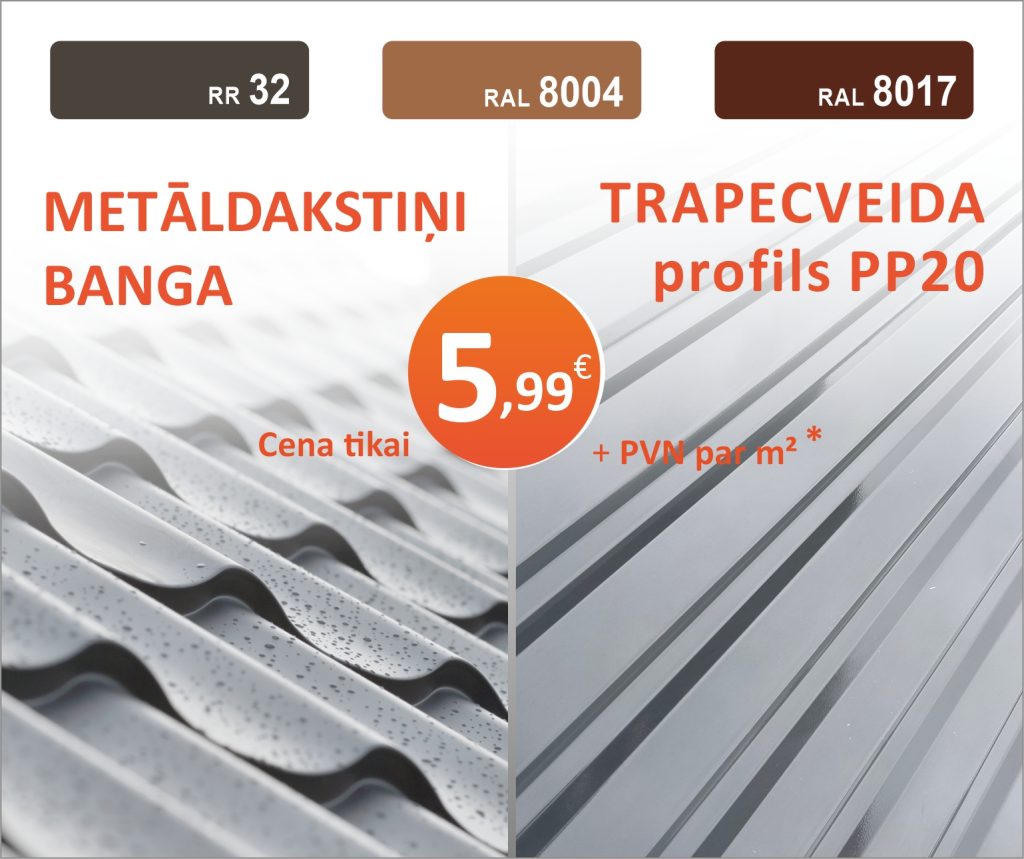 Tagad par lielisku cenu pieejami Metāldakstiņi BANGA un Trapecveida profils PP20 ar kvalitatīvu PE pārklājumu 0,5 mm.